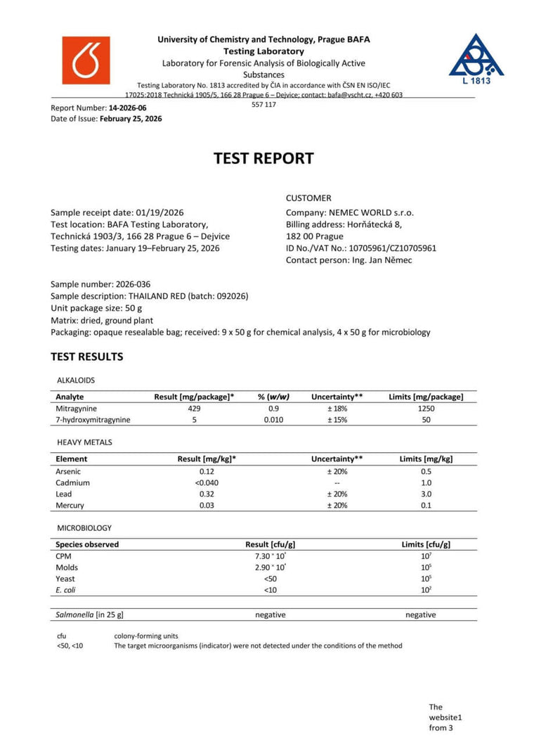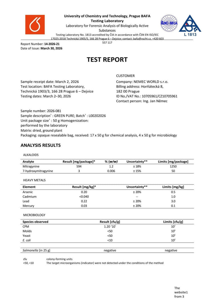 With us you can be sure that you are buying Kratom of the highest quality. As the only company on the European market, we carefully test each batch at VŠCHT in Prague, where we determine the exact percentage of alkaloids and the presence of living or non-living fungi.