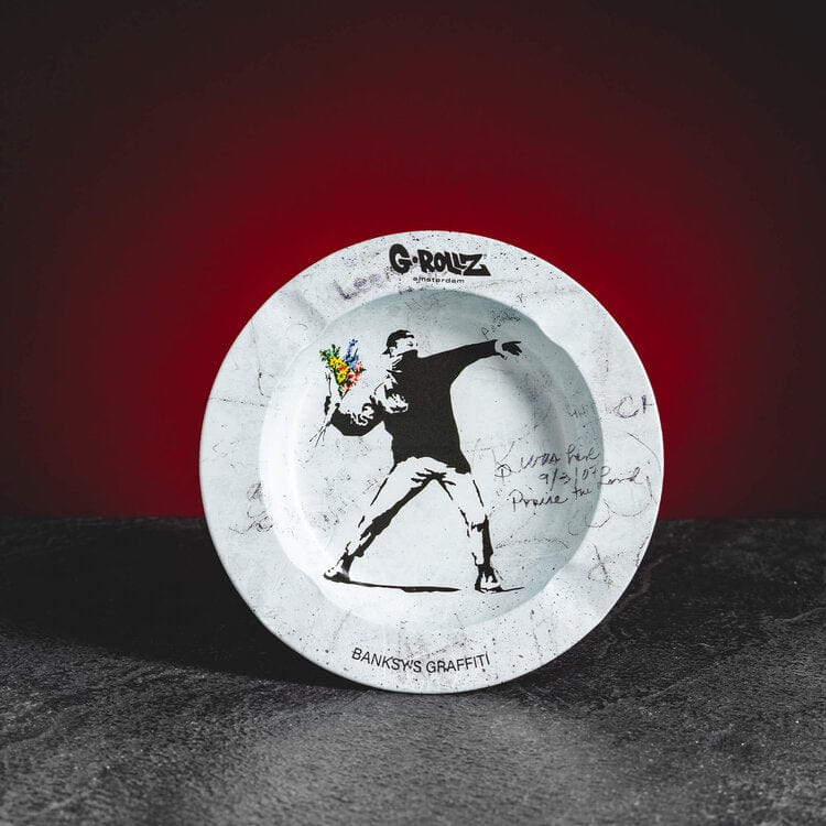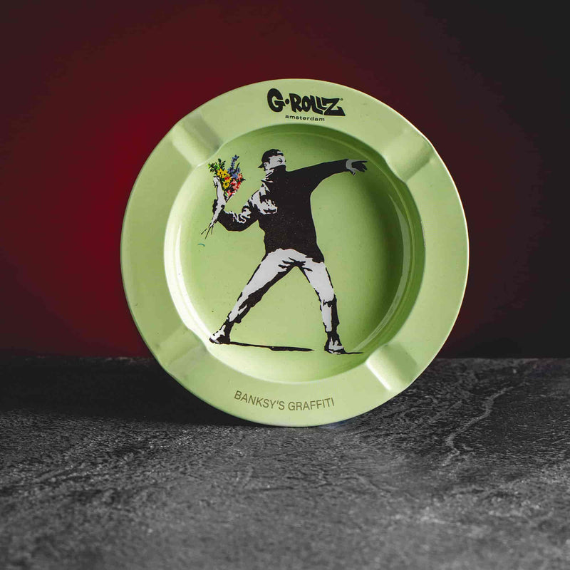 Metal ashtray with a diameter of 13.5cm, available in various designs from Banksy's workshop.